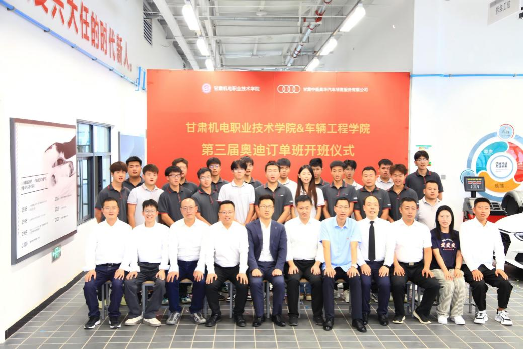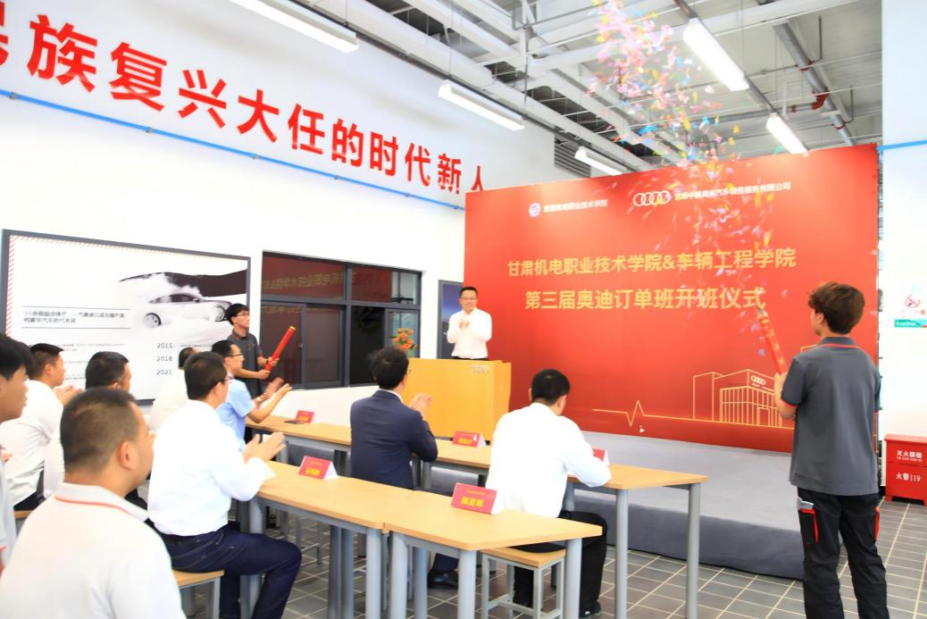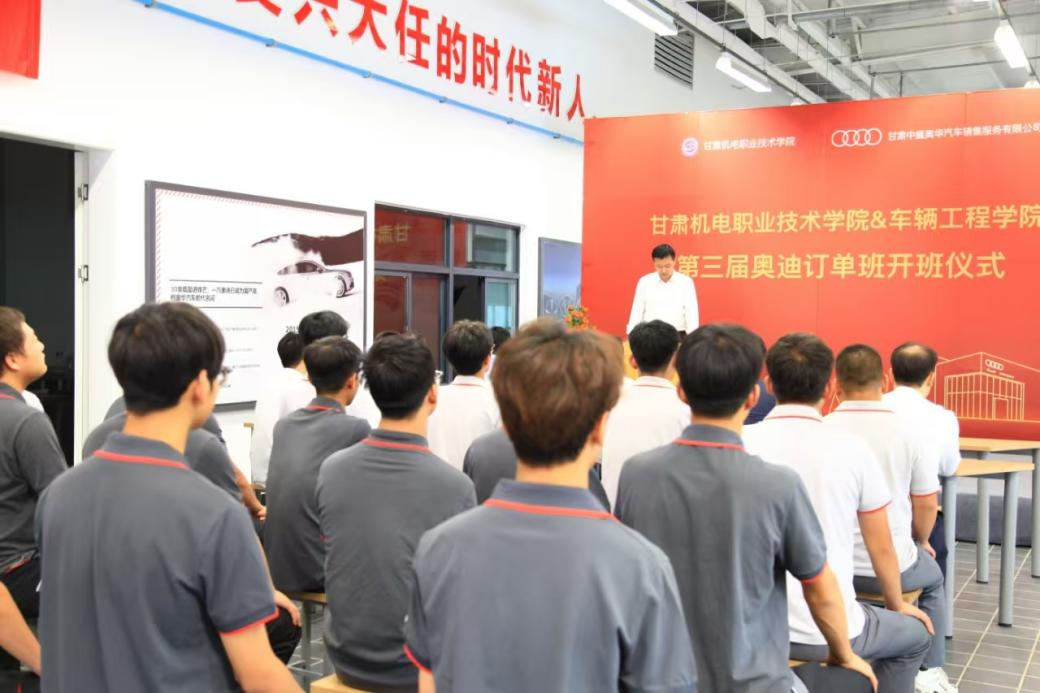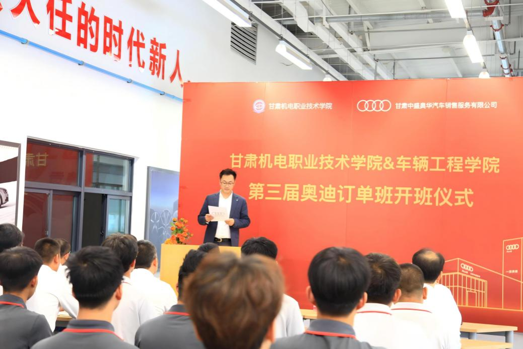 仪式上,甘肃中盛奥华汽车销售服务有限公司总经理葛建云首先向加入奥迪订单班的各位学员表示热烈的欢迎,然后从企业发展前景、用人标准、订单班培育成果产出等方面做出详细阐述,鼓励同学们以秋季的丰饶,滋养技术的种子,以奥迪的创新精神,点燃学习的火花。期待每一位学员都能在这里找到属于自己的未来之路,实现梦想。