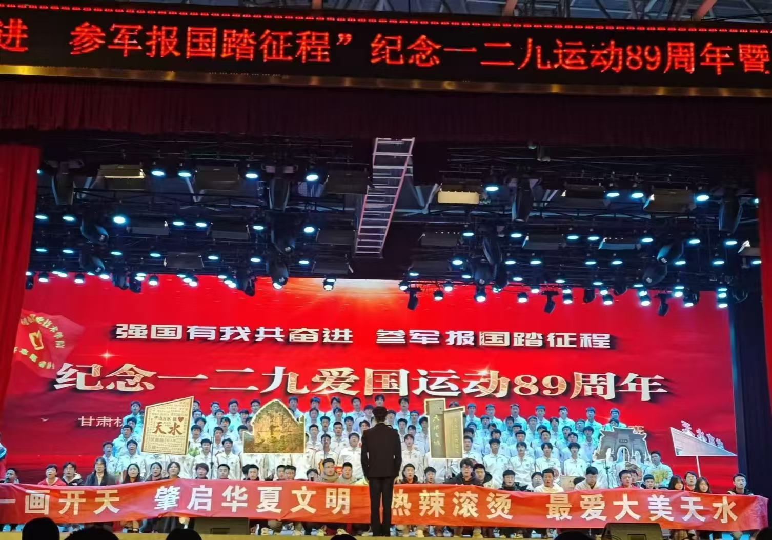 合唱歌曲《在天水等你》,以学校所在地龙城天水为主题,同学们用饱满的热情和嘹亮的歌声传递着对祖国、对家乡深深的热爱,那悠扬的旋律仿佛带着观众穿越时空,从伏羲庙前的岁月沉淀,到卦台山巅的历史追溯;从麦积烟雨的诗意朦胧,到丝路花雨的往昔繁华。每一句歌词都如同一幅历史画卷,表达了我院学子爱国爱家的热爱之情。